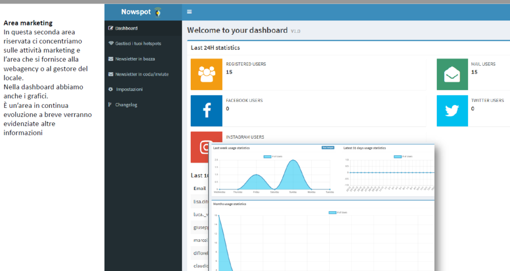 E’ bene quindi avere un sistema di gestione che permetta un uso bilanciato e controllato della banda internet a disposizione assegnando ai vari clienti specifici limiti di upload e download personalizzati , impedendo l’accesso a siti categorizzati come maligni ( pedopornografica, hacker, terrorismo etc) o semplicemente a siti “Bandivori” come ad esempio gli upgrade di Microsoft.. Il sistema dovrà anche disconnettere gli utenti che non fanno traffico permettendo a tutti un uso corretto del servizio. In questo modo una banda limitata può essere usata con soddisfazione da molti utenti nella struttura tenendo tutto sotto controllo . La gestione degli accessi va resa automatizzata mediante “social login” e iscrizione al portale con al propria mail ma può anche essere gestita con ticket generati al momento o importati da elenchi ( si immagina quelli da generare facilmente per un elenco di convegnisti) . Con il Social Login si velocizza e automatizza la procedura di gestione degli account e si recuperano informazioni preziose sugli utenti della struttura utili per campagne di comunicazione e pubblicità . Il sistema può essere configurato in modo tale da spingere il cliente a mettere il like sulla pagine facebook della struttura e a visitare, senza limiti le offerte commerciali in vigore al momento della connessione raggiungendo in breve tempo interessantissimi risultati commerciali.